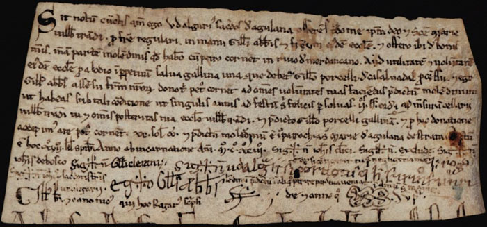 16 d'agost de 1193. Donació que fa Udalguer, sacerdot d'Agullana, en ingressar a Santa Maria de Vilabertran com a germà regular de la seva parta de molí que té amb Pere Cornet al riu de Merdançà, situat a Santa Maria d'Agullana de l'Estrada (sic). Biblioteca de Catalunya - (Ampliar)