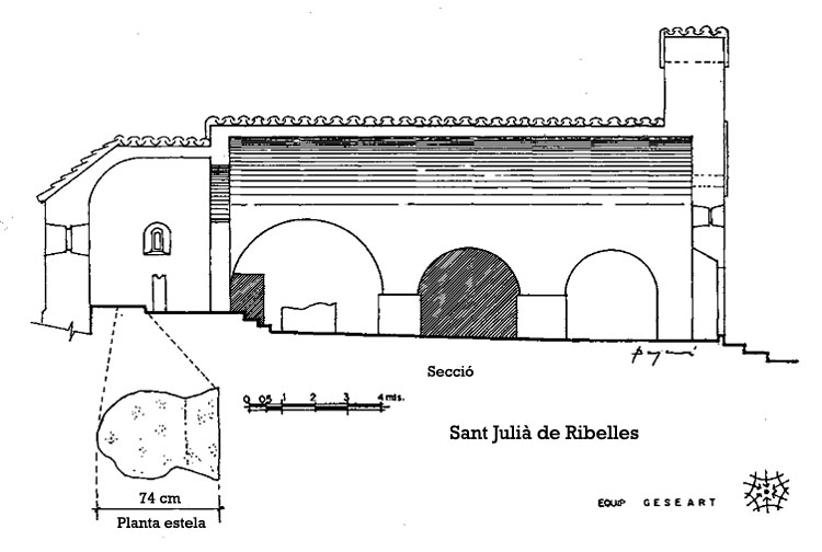 Fundació del monestir de Sant Llorenç del Mont o de Sous, és un dels centres més vius de devoció no solament de l’Alt Empordà sinó també de les comarques veïnes de la Garrotxa i el Pla de l’Estany. Gaudeix d’una magnífica vista panoràmica sobre les tres comarques i sobre els Pirineus; és tradició que Jacint Verdaguer, que hi passà l’estiu del 1884, s’inspirà aquí per al seu poema "Canigó". ![]() Planta de Sant Julià de Ribelles. GESEART, publicat a "La cista amb túmul de la Creu de Principi..." (op-cit) - (Ampliar)