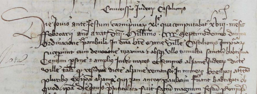 A partir del segle XIV comencen a aparèixer alguns barris situats extramurs. La vila posseïa dos hospitals, l'Hospital Major o de Santa Llúcia, prop de l'església, i un hospital de mesells al barri de Sant Llàtzer, extramurs. De l'època medieval han quedat pocs edificis; de l'Hospital Major no en queda cap resta. Alguns varen ser reconstruïts durant els segles XVIII i XIX, com la casa de la Canònica, la casa del monestir de Sant Pere de Rodes i alguns convents. ![]() Detall de la narració de la conversió de més d’un centenar de jueus de Castelló d’Empúries el 1417. Notaria de Castelló d’Empúries, 538, f. 120v. Arxiu Històric de Girona. - (Ampliar) Els jueus de Castelló.