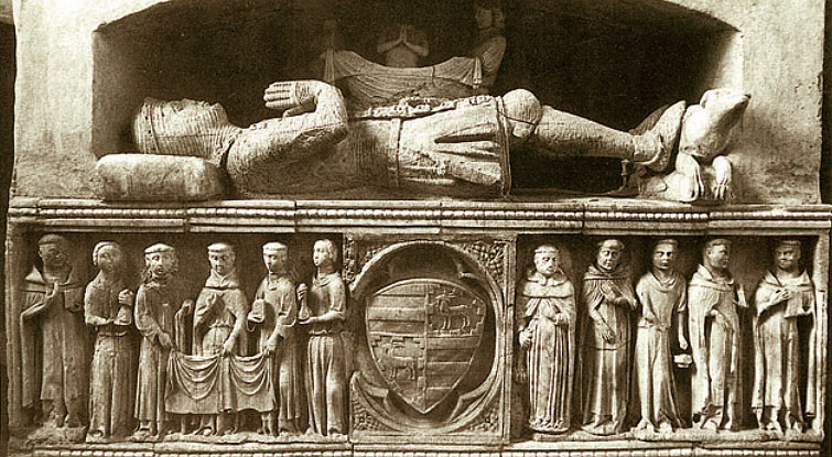 En altres documents, entre el 944 i el 990, es parla de l’estany de Castelló i de la vila, la qual ja tenia un territori propi. Quan el 1007 s’esmenta per primera vegada l’església de Santa Maria de Castelló, el lloc pertanyia al pagus o comtat de Peralada o del castro Tolon. ![]() Tomba del comte Ponç Hug V, dit Malgaulí, fundador del convent de Sant Domènec. Actualment, a l'absis de la Catedral. - (Ampliar) La capitalitat comtal