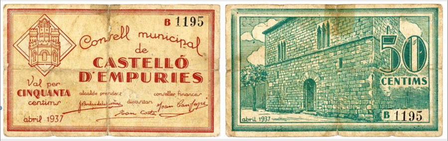 Durant la tercera Guerra Carlina, a primers de novembre de 1874 les forces carlines de Francesc Savalls, comandades per Capdevila varen entrar a recaptar contribucions. L'hostilitat dels milicians castellonins va desencadenar l'atac del sanguinari Xic de Sallent, que va entrar a la vila a sang i foc. El dia 3 arribava el brigadier Moya procedent del castell de Sant Ferran, amb 800 soldats, 85 cavalls i 2 canons Krupp, i després d'un dur combat, va aconseguir travessar el pont i entrar a la vila. A la tarda arribava Savalls amb 900 homes i va ordenar l'atac sobre el pont defensat pels republicans. Després de traspassar-lo, es varen trobar dins les muralles tres grups que es perseguien mútuament. La lluita va continuar els dies 4 i 5. Savalls va fingir un replegament, i els republicans van aprofitar-ho per fugir, però, atrapats entre dos focs, varen caure presoners dels carlins. Savalls hi va perdre diversos oficials, 80 soldats ferits i 20 morts. Els morts republicans no van ser menys, i el 150 presoners que va fer Savalls eren tots ferits. A la vila les conseqüència de l'anomenat Foc de Castelló varen ser de sis morts, innombrables famílies robades i mig poble enderrocat i cremat. ![]() Consell Municipal de Castelló d'Empúries, val per cinquanta cèntims, abril 1937. Biblioteca de Catalunya - (Ampliar) El segle XX.
