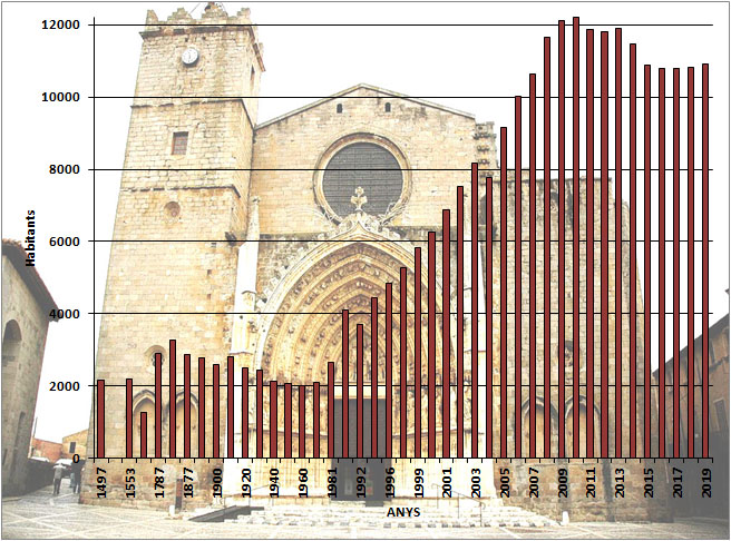 La Guerra Civil (1936-1939) provocà víctimes d'un i altre bàndol, ocasionant una davallada de la població. El 22 de juliol de 1936, el Comité de Milícies Antifeixistes confiscà l'església i detingué gran nombre de veïns de dretes, i els capellans Lluís Frigola i Tomàs Miralpeix, que varen ser assassinats. El 2 de febrer de 1939 arribaven les tropes franquistes i s'iniciava una època on les delacions i les intrigues portaren la intranquil·litat a una part del poble. Les víctimes ho eren a causa de la seva adscripció política o per rancúnies personals. ![]() Vista general de l'asil Duran. 1911-1936. Valentí Fargnoli i Annetta. CRDI - Ajuntament de Girona - (Ampliar) ![]() Evolució demogràfica de Castelló d'Empúries. Les dades dels anys 1497-1553 s'han estimat en base als focs: 1497, 169 focs; 1515, 108 focs; 1553, 213 focs. Les dades del període 1717-1981, corresponen a població de fet; a partir de 1990, població de dret. - (Ampliar)