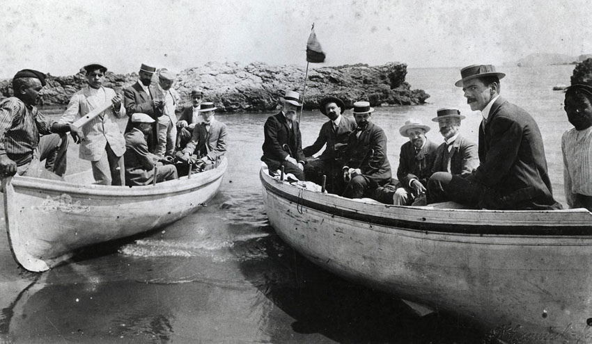 A l'espai guanyat amb l'ampliació de la muralla cap al sud de la ciutat el segle II aC es construïren diversos edificis de caràcter religiós que, en part, poden ser identificades amb un Asklepieion; amb l'ampliació de la muralla, el primitiu recinte d'Asclepi, del segle IV aC, es va modificar completament, i va quedar a partir aleshores dins els murs. L'Asklepieion era un centre terapèutic i religiós consagrat al déu Asclepi. El recinte de Serapis. A mitjan segle II aC, al mateix temps que es construïa la muralla externa de la ciutat i es demolien la muralla grega del segle IV aC i el parapet del segle III aC, a Empúries es va decidir construir una plaça porticada en l'espai guanyat en desplaçar la muralla. Més endavant, probablement en la primera meitat del segle I aC, aquesta va tenir una important transformació, en ser construït a la seva zona occidental un temple tetràstil, dòric i amb escales laterals, consagrat segurament a la divinitat de Serapis. Per l'existència d'aquest recinte, es pressuposa la importància que van tenir a Empúries en els períodes hel·lenístic i republicà, els cultes procedents del Mediterrani oriental, segurament per l'arribada de mercaders d'Orient, que van aprofitar l'existència d'una ciutat portuària, oberta a l'exterior, per a establir-s'hi i transformar-la, als segles II i I aC, en un empori comercial i cultural de gran influència. ![]() Dues barques, amb diverses personalitats civils i polítiques, davant del port romà d'Empúries. Entre ells s'identifica a Carles Rahola 1908-1909. Josep Esquirol Pérez.. CRDI - Ajuntament de Girona. - (Ampliar) La ciutat romana.