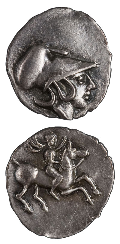 Dracma. Inicis del segle III aC. Inscripció ENPORITON, amb cap de Persèfone, a l'esquerra, i cavall parat, a la dreta; a sobre, Victòria amb una corona. Argent. Museu Nacional d'Art de catalunya. - (Ampliar)