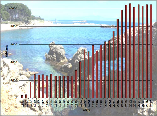 En una data que se situa entre Gausfred (931-991), fill de Gausbert, i Hug II (1078-1116) té lloc el trasllat de la capital del comtat a Castelló, segurament davant de la inseguretat de l'indret de Sant Martí. El 1154, Sant Martí d'Empúries rep per última vegada la qualificació de ciutat; en endavant, se l'esmentarà com a castell i vila d'Empúries. El 1248 es va construir la volta, la teulada, el paviment i el campanar de l'església, que segurament encara era la preromànica. ![]() Núria Espert i Irene Papas agafant la torxa Olímpica a Sant Martí d'Empúries. 1992. Autor desconegut. CRDI - Ajuntament de Girona. - (Ampliar) ![]() Evolució demogràfica de L'Escala. Les dades dels anys 1497-1553 s'han estimat en base als focs: 1497, 49 focs; 1515, no hi dades; 1553, 58 focs. Les dades del període 1717-1981, corresponen a població de fet; a partir de 1990, població de dret. Dades recents extretes d'Idescat. - (Ampliar) Bibliografia