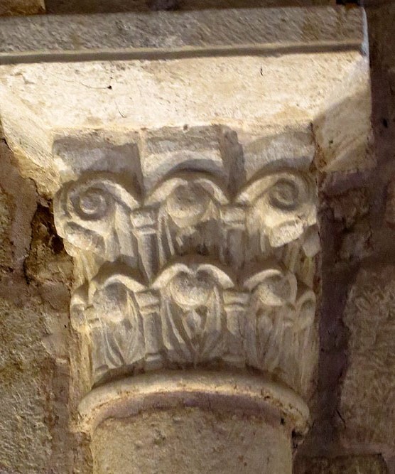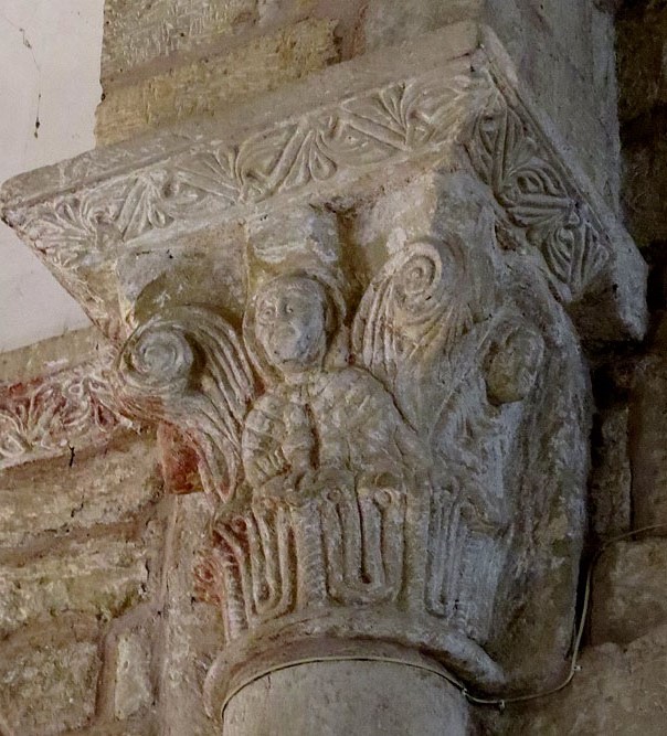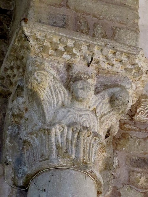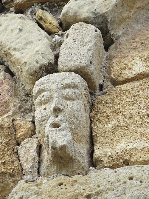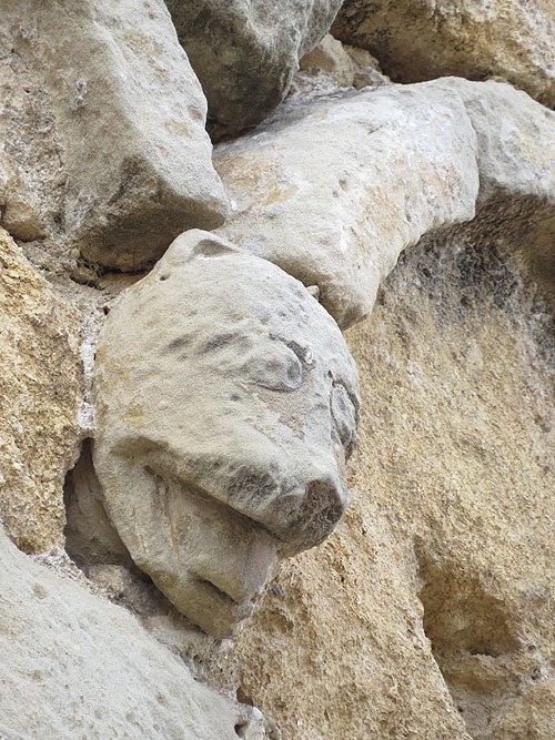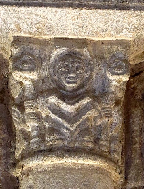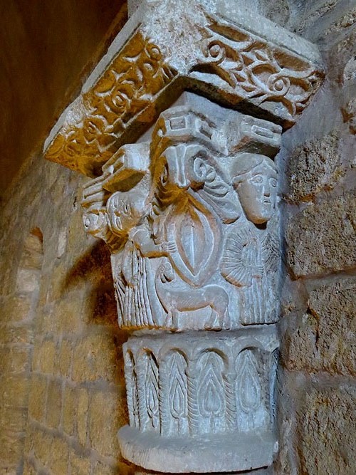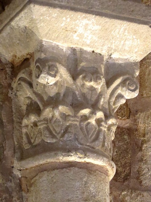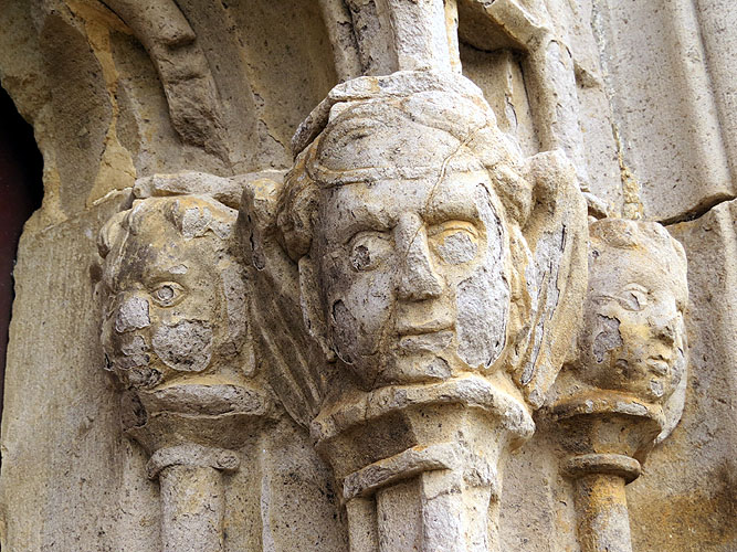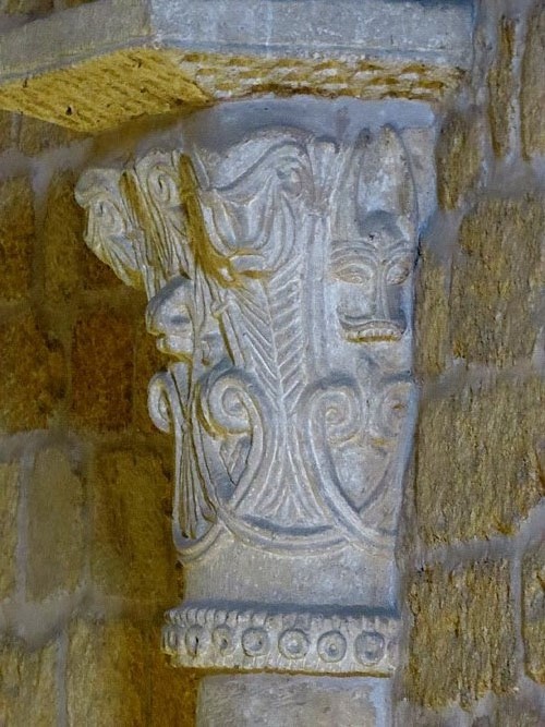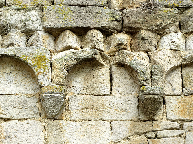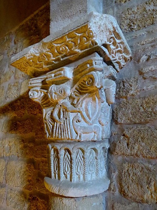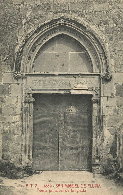 El mur esquerre de l'església conserva a la part superior els merlets rectangulars, cadascun dels quals manté una petita sagetera. ![]() Mènsules de la llinda de la porta d'entrada a l'església de Sant Miquel de Fluvià - (Ampliar)