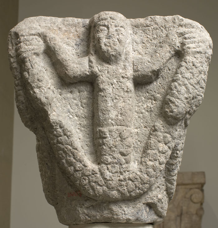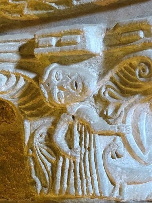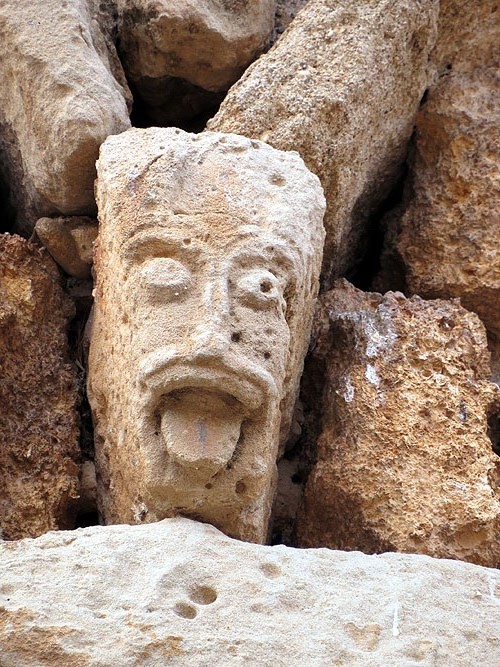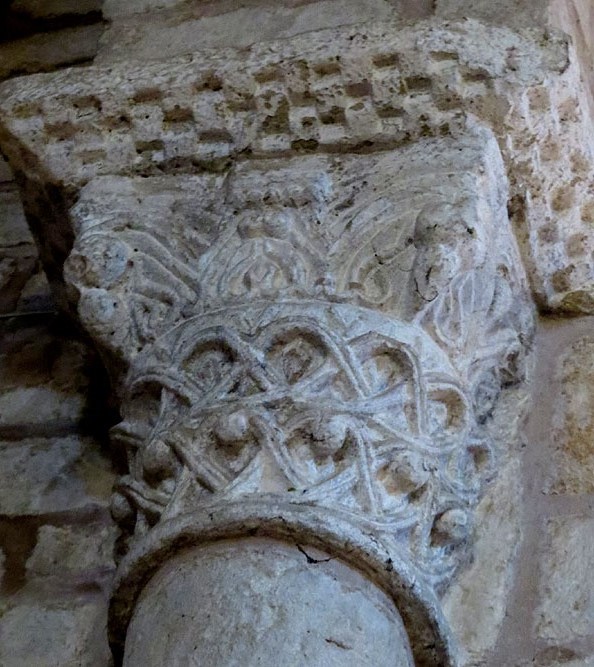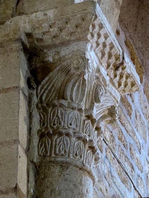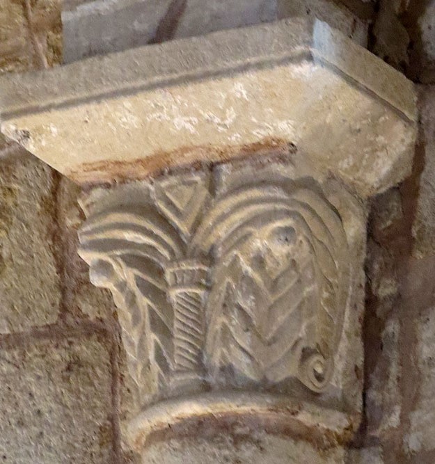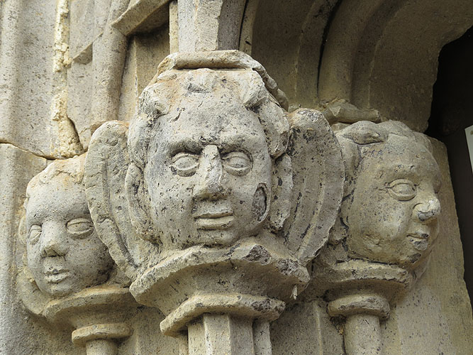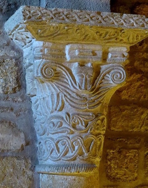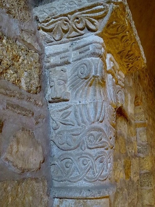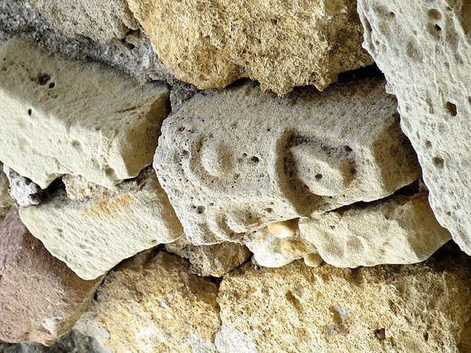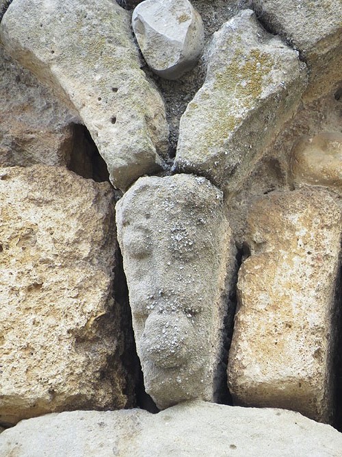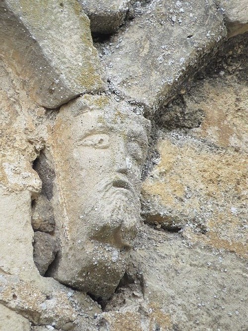 El mur esquerre de l'església conserva a la part superior els merlets rectangulars, cadascun dels quals manté una petita sagetera. ![]() Mènsules de la llinda de la porta d'entrada a l'església de Sant Miquel de Fluvià - (Ampliar)