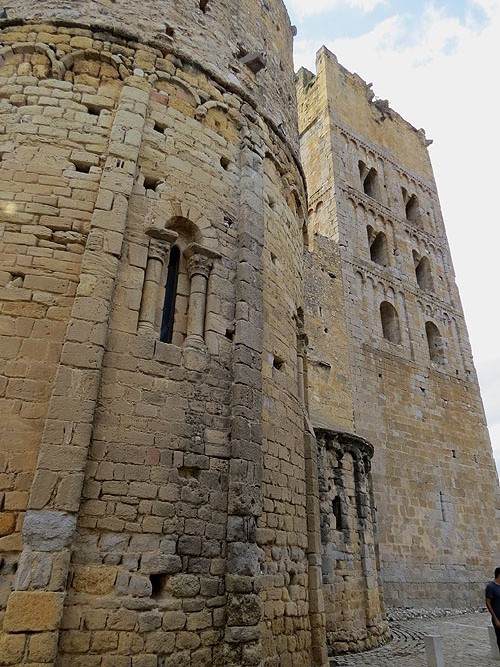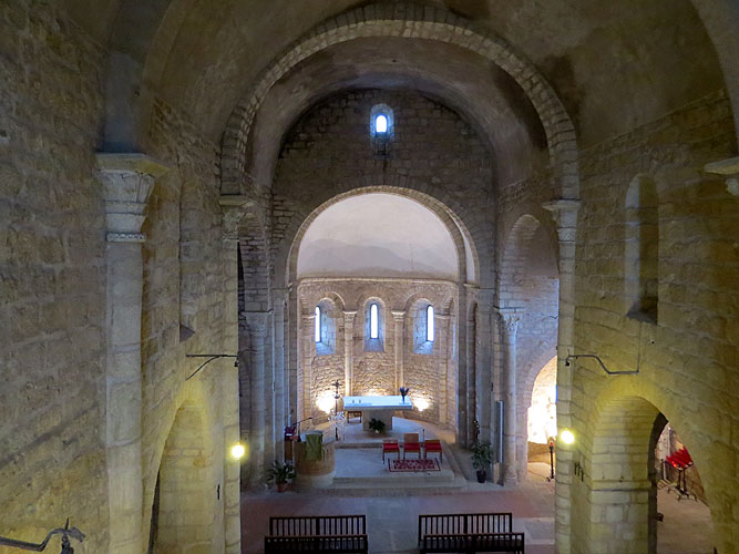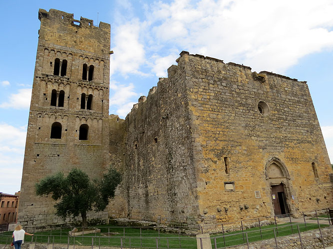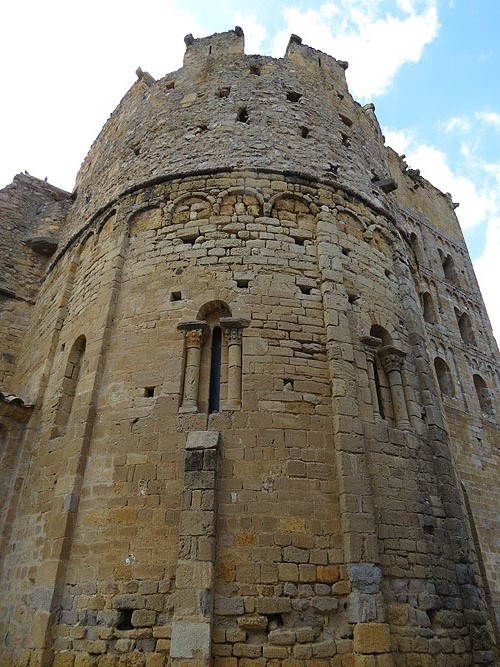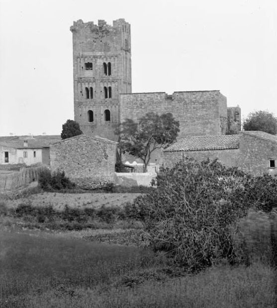 Sant Miquel de Fluvià Monestir de Sant Miquel de Fluvià (segles XI, XII i XV) Història del monestir. El complex monàstic va néixer com una abadia depenent de Sant Miquel de Cuixà, que posseïa aquest indret com a mínim des del 1011, atès que és citat com una possessió seva en una butlla del papa Sergi IV: "...in comitatu Impurdano [...] ecclesiam de Fluvianao cum suis terminis et pertinentiis". L'any 1045 es consagrà el terreny on s'havia de construir el nou monestir, cerimònia a la qual assistí Oliba, abat de Cuixà i de Ripoll, d’acord amb el comte d’Empúries i l’arquebisbe de Narbona. El 1066 es consagrà l'església, després de plets sobre la seva propietat amb el senyor local Guillem de Fonolleres, a la qual s'afegí el campanar a principis del segle XII. La comunitat s’hi devia reunir entre el 1045 i el 1066, i era regida per un abat, amb un nombre de monjos que oscil·là de vuit a quatre al llarg dels segles XII, XIII i XIV. ![]() Façana de l'església de Sant Miquel de Fluvià - (Ampliar)
