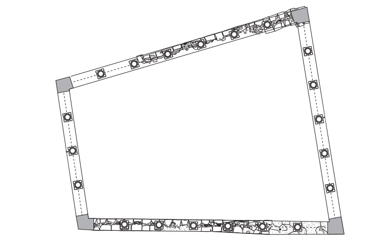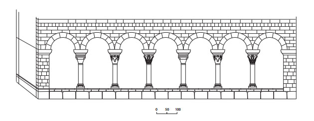 A les mènsules situades a la base i a cada extrem de la llinda s'hi poden veure, en cada una d'elles, tres caps alats d'àngels. Les mènsules d'on surten els feixos d'arquivoltes dels arcs apuntats són decorades amb un cap alat i un animal fabuló, el del costat nord té el relleu erosionat, i el de la banda oposada sosté un escut partit al qual hi veiem una estrella de vuit puntes a dalt i tres corones a baix. Més amunt de la porta hi ha un petit i senzill rosetó. ![]() Restitució teòrica en planta del claustre de Sant Miquel de Fluvià, a partir de les restes conservades. Publicat per A Ferr i J. Tremoleda a "El monestir de Sant Miquel de Fluvià", citat a la bibliografia. - (Ampliar) Tot el costat meridional de l'església dóna a un pati on hi havia hagut el claustre del monestir, i altres dependències monàstiques, posades al descobert en les excavacions recents (2010-2011) (1). A l’interior de l’església es conserven dos fusts i dos capitells que procedeixen del claustre del monestir. Durant les excavacions del 2011 es va localitzar un tercer capitell. Al MNAC s'en conserven tres més. Al mur lateral de la nau de migdia s'hi pot veure la porta que comunicava l'església amb el claustre, avui tapiada. Es tracta d'una porta de petites dimensions, d'un sol arc de mig punt fet amb petites dovelles, amb llinda i timpà. Al costat de la porta hi ha una finestra de doble biaix i arcs de mig punt. ![]() Restitució teòrica en alçat del claustre de Sant Miquel de Fluvià, a partir de les restes conservades. Publicat per A Ferr i J. Tremoleda a "El monestir de Sant Miquel de Fluvià", citat a la bibliografia. - (Ampliar)