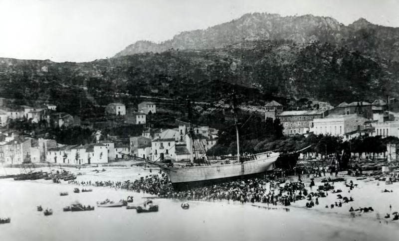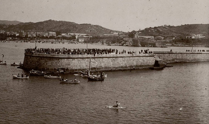 A la primera meitat del segle XIX la població ganxona va seguir creixent però va tenir una davallada i una posterior recuperació a causa dels problemes sanitaris; les epidèmies no acabaven de marxar del tot. La població es mantingué durant dècades al voltant dels 6.000 habitants. ![]() Obres de construcció del moll. 1906. Amadeu Mauri Aulet. INSPAI - Diputació de Girona