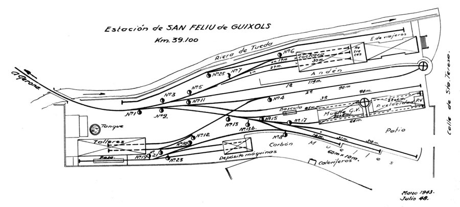 Va ser una època marcada sobretot pels canvis de mentalitat, un anticlericalisme en augment. Especial va ser la figura de Pere Caimó i Bascós, un federal, que en arribar a l'alcaldia de la vila, instaurà un seguit de decrets clarament progressistes i republicans. Això li va comportar disputes amb el general Prim i va estar uns anys exiliat. ![]() Plànol de l'estació del tren de Sant Feliu. 1943. Arxiu Municipal de Sant Feliu de Guíxols. - (Ampliar)