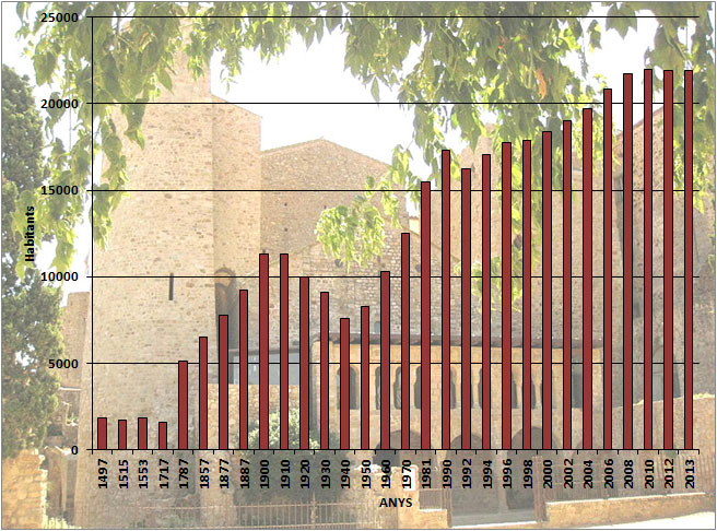 D'aquests anys també cal destacar la inauguració de dos avenços en el transport i la comunicació: l'estació del tren que unia Sant Feliu de Guíxols i Girona, passant per la Vall d'Aro, el 1892, i el port marítim el 1904. ![]() El creuer 'Canarias'. Va bombardejar Sant Feliu de Guíxols el 23 de febrer de 1938. Viquipèdia - (Ampliar) El 23 de febrer de 1938 a les 7:15 del matí dos creuers sollevats, el "Canarias" i el "Baleares", apareixien davant el port de Sant Feliu de Guíxols. Al moll hi havia amarrats tres vapors i dos guardacostes republicans, el "Ana" i el V16, en realitat vaixells civils, militaritzats i reconvertits en patrullers o guardacostes. El "Canarias" i el "Baleares" varen disparar fins a 40 trets contra el port, just en el moment que entrava el vapor "Cabo Tres Forcas" que va resultar tocat en el pont de comandament. Alguns trets varen arribar a tocar la ciutat, resultant afectades cases del carrer Pecher, del carrer Hospital i del carrer del Mall on la metralla va matar un carrabiner i va produir diversos ferits. Les bombes també varen destruir molts arbres del passeig de Mar i de la rambla d’Antoni Vidal. Un bon nombre de teulats de les cases de la part baixa de Sant Feliu patiren desperfectes per la caiguda de la metralla. El 3 de febrer del 1939 Sant Feliu va ser ocupada per les tropes franquistes. ![]() Excursió artística de l'Orfeó Català a Sant Feliu de Guíxols. 1928. Centre de Documentació de l'Orfeó Català - (Ampliar) A partir d'aquest moment la situació va empitjorar: la població que havia superat els 12.000 habitants a principis de segle, va veure com l'any 1940 n'hi havia poc més de 7.000. La postguerra va ser lenta, però a partir de 1955 ja presentava clars símptomes de millora, de manera que l'any 1975 la població ja sobrepassava el llindar dels 14.000 habitants. Durant la primera meitat de la postguerra va viure a França, exiliat, el president de la Generalitat de Catalunya Josep Irla i Bosch, fill de Sant Feliu. Mai més, després de l'any 1939, no va poder tornar a casa seva. Mentrestant, a la ciutat la vida va transcórrer sense sobresalts, amb uns polítics-titella i amb un desenvolupament del sectors serveis que es materialitzà a partir de l'any 1955 amb la inauguració de diversos hotels i el boom turístic generalitzat a tota la Costa Brava. ![]() Evolució demogràfica de Sant Feliu de Guíxols. Les dades dels anys 1497-1553 s'han estimat en base als focs: 1497, 258 focs; 1515, 240 focs; 1553, 264 focs. Les dades del període 1717-1981, corresponen a població de fet; a partir de 1990, població de dret. - (Ampliar)