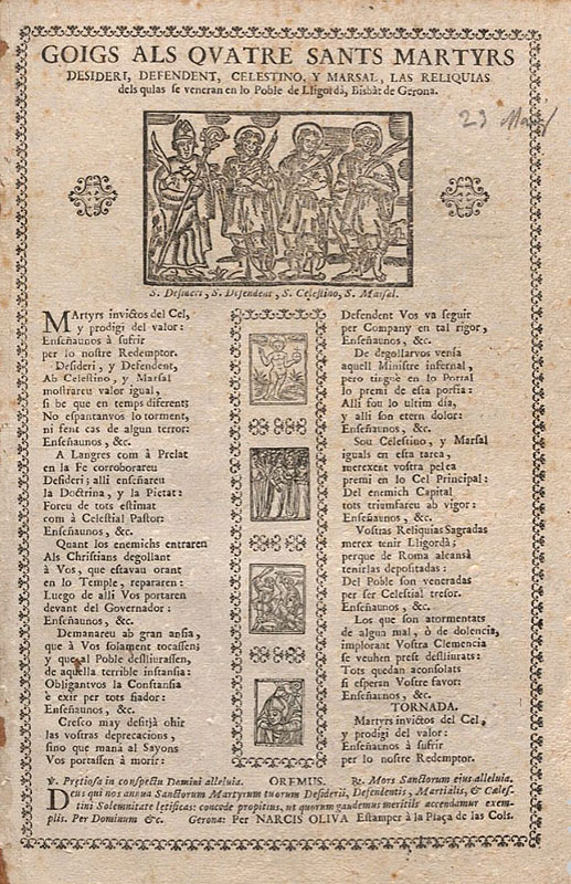 Goigs als quatre sants martyrs Desideri, Defendent, Celestino, y Marsal: las reliquias dels quals se veneran en lo poble de Lligordà, Bisbàt de Gerona. Ca. 1760. Biblioteca de Catalunya - (Ampliar)