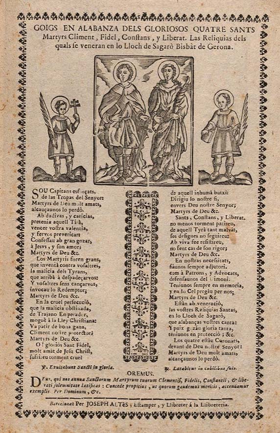 Goigs en alabanza dels gloriosos quatre sants martyrs, Climent, Fidel, Constans, y Libertat: las reliquias dels quals se veneran en lo lloch de Sagarò, Bisbàt de Gerona. Ca. 1740. Biblioteca de Catalunya - (Ampliar)
