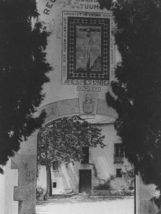 Porta d'accés al pati de Can Noguer amb una imatge religiosa al capdamunt. Ca. 1936. Joan Nonell Febrés. Arxiu Fotogràfic Centre Excursionista de Catalunya - (Ampliar)