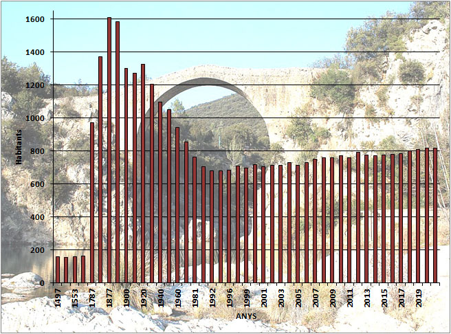 La tomba més important era la dels nobles Alemany de Bellpuig, construïda al principi del segle XV; estava situada al presbiteri, al costat de l'evangeli, amb una llosa. Una escala amb graons de pedra donava a un recinte en el qual, a dreta i esquerra, hi havia les sepultures dels senyors i llurs familiars. El darrer senyor enterrat va ser en Carles Alemany de Bellpuig i Fontanella, baró de Tortellà, l'any 1721. Fins als voltants del 1790 a l'entrada de l'església hi hagué una ossera de pedra d'aquesta família. ![]() Pont de pedra sobre el riu Llierca a l'altura de Tortellà. 1911-1936. Valentí Fargnoli i Annetta. CRDI - Ajuntament de Girona. - (Ampliar) El pont del Llierca. És la construcció més antiga de Tortellà que s'ha mantingut intacte fins avui. Situat just a la vora de la carretera que va de Montagut i Oix al nucli de Sadernes, va ser edificat entre al final del segle XIII i principis del XIV, amb finalitats estrictament comercials, atès que aquest pont comunicava les cases de pagès del vessant oest del riu amb Tortellà i Besalú. Està construït amb pedra nummulítica i a sobre d'un rocam calcari, que s'aixeca a uns 8 metres sobre el nivell de les aigües del riu. Té una longitud de 20 metres de llargada i entre 2,30 i 3,10 d'amplada. ![]() Evolució demogràfica de Tortellà. Les dades dels anys 1497-1553 s'han estimat en base als focs: 1497, 29 focs; 1515, 28 focs; 1553, 29 focs. Les dades del període 1717-1981, corresponen a població de fet; a partir de 1990, població de dret. Dades recents extretes d'Idescat. - (Ampliar) Bibliografia
