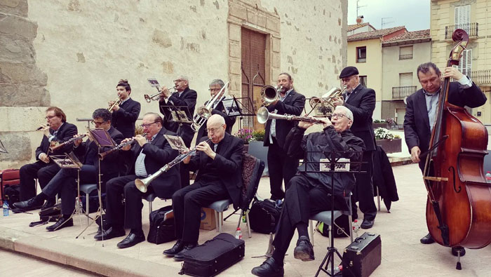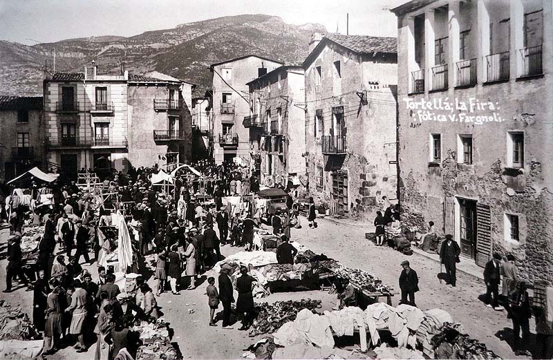 Durant la Tercera Guerra Carlina, el 1873, la vila va ser castigada per la carlinada, que hi provocà un incendi que destruí la major part dels edificis. Les tropes de l'Infant Alfons i la seva muller Maria de les Neus, combinades amb les de Savalls i el seu lloctinent Auguet, que el 20 d'agost de 1873 eren a Ripoll, van traslladar-se a la Garrotxa, per Vallfogona i el coll de Canes, aprofitant la nit, per arribar a Tortellà a l'entrada de fosc del dia 21, després d'haver reposat durant unes hores a Riudaura. De seguida van envoltar la població i començà la lluita pels carrers del poble. ![]() Retrat dels components de la cobla orquestra La Principal de Tortellà sobre un fons amb una vista de la població. D'esquerra a dreta i de dalt a baix: M. LLansa, P. Quer (representant), Anton Capdevila, A. Puntí (representant), J. Puntí, Llorenç Jou, N. Oliveras, F. Blanch, N. Bosch, J. Font i M. Puntí. 1922. Valentí Fargnoli i Annetta. CRDI - Ajuntament de Girona. - (Ampliar)