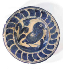 Bol de ceràmica catalana vidriada en blau i reflexos daurats marrons del segle XV. 13,5 cm de diàmetre d’obertura i 5,5 cm d'altura. Procedent de Cal Moliner. Museu Arqueològic de Banyoles. - (Ampliar)