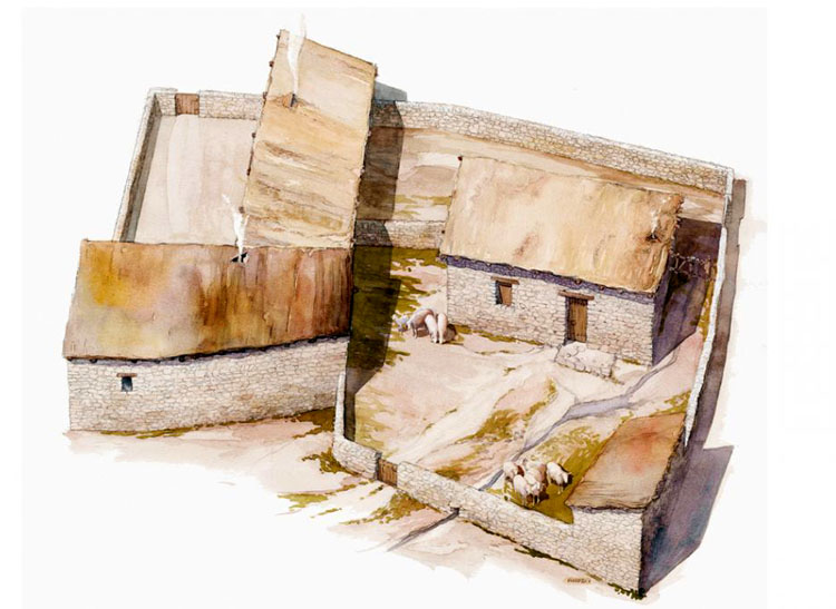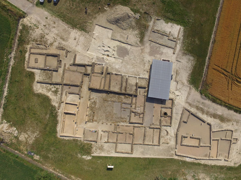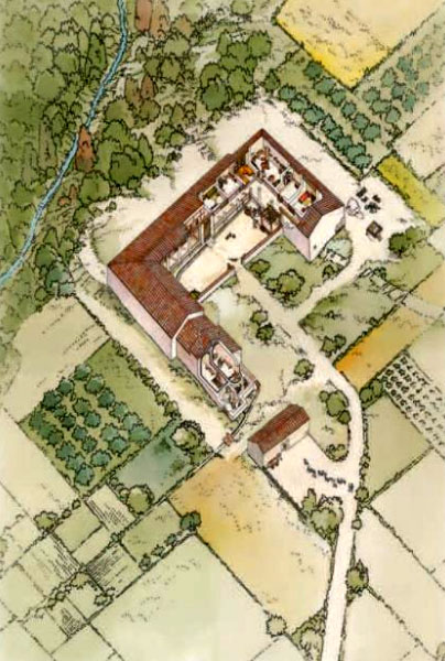 Està situada en una vall que s’estén a uns tres quilòmetres al sud del municipi i de l’estany de Banyoles. Va ser descoberta el 1932 durant les obres de construcció de la carretera que porta a Pujarnol, tot i que la recerca arqueològica sistemàtica no va començar fins l’any 1978. ![]() Fragment d'inscripció dedicada a Germànic. Segle I dC. Generalitat de Catalunya - (Ampliar) La vil·la altimperial. Segles I-III dC. Tot i els indicis de l’existència d’un establiment agrícola més antic, l’etapa més ben coneguda de la vil·la correspon a aquest període. En aquest moment l'habitació s’organitzava al voltant d’un pati central delimitat per unes galeries porticades, definit al nord per un sector residencial i per estructures d’ús agrícola a la banda sud. Del conjunt d’estances descobertes són importants les situades a l’ala nord, que van patir un incendi posterior però van permetre recuperar tot el parament de la casa. S’han pogut identificar el larari o capella de la casa on es van recuperar tres estatuetes de bronze que representaven divinitats; el rebost de la vila on es van trobar més de 200 peces de terrissa i el triclinium o menjador que com a sala noble de la casa tenia les parets decorades amb pintures murals. ![]() Altar romà de Vilauba. Segle III dC. Generalitat de Catalunya - (Ampliar) D’aquest període també es conserven parts de les termes, l’àrea del forn (praefurnium) i els extrems de dues sales, avui sota la carretera: una d'aigua calenta (caldarium) i una altra corresponent a un tepidarium. El final d’aquesta construcció ve marcat per un incendi que va destruir totalment l’ala nord de la casa i que va obligar els seus habitants a emprendre una reforma global. ![]() Vista aèria de la vil·la romana de Vilauba. Museus de Banyoles - (Ampliar) La vil·la baiximperial. Segles IV-V dC. Durant el segle IV la vil·la va gaudir d’una certa estabilitat i puixança, que es fa evident en unes noves instal·lacions distribuïdes igualment entorn d’un gran pati. La vil·la d’aquest període és de grans dimensions, de les quals una bona part corresponen a les instal·lacions agrícoles. Destaquen les restes d’una premsa i altres estructures relacionades amb la producció de vi i oli. A partir del segle V es comencen a detectar els primers símptomes d’una regressió material, s’abandonen alguns sectors i es reutilitzen alguns espais com a zona d’enterrament. ![]() Restitució de la premsa utilitzada a la banda nord de la vil·la de Vilauba. Dibuix de J. Sagrera - (Ampliar) La darrera etapa de Vilauba. Segles VI-VII dC. L’abandonament de la vil·la al segle V dC no va suposar el final del jaciment; just al costat s’hi va construir un petit vilatge o poblat visigot, durant els segles VI-VII, format per tres cases amb els seus respectius patis. Durant aquest període l’ocupació es limitava a unes poques edificacions relacionades amb l’explotació agrícola, el que significava una reducció important de la superfície ocupada. Les últimes campanyes d’excavació, però, han posat al descobert la zona residencial d’aquesta etapa, que sembla molt més important del que es considerava. L’abandonament final del jaciment es va produir en un moment imprecís del segle VII. ![]() vilatge visigot de Vilauba. Segle V-VII dC. Dibuix de Jordi Sagrera. Generalitat de Catalunya - (Ampliar)