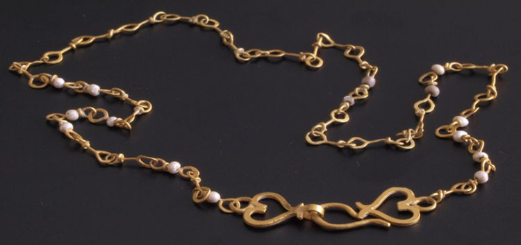 L’any 1372 es documenten per primer cop els dos nuclis de poblament actuals, Sant Vicenç i Santa Maria de Camós, en ocasió de redimir l’impost de bovatge, que cobraven els reis normalment a l'inici del regnat i que gravava la possessió de bestiar i els béns mobles i seents, al rei Pere el Cerimoniós. ![]() Collaret d'or i perles de riu de Vilauba. Segle II-III dC. Generalitat de Catalunya - (Ampliar)