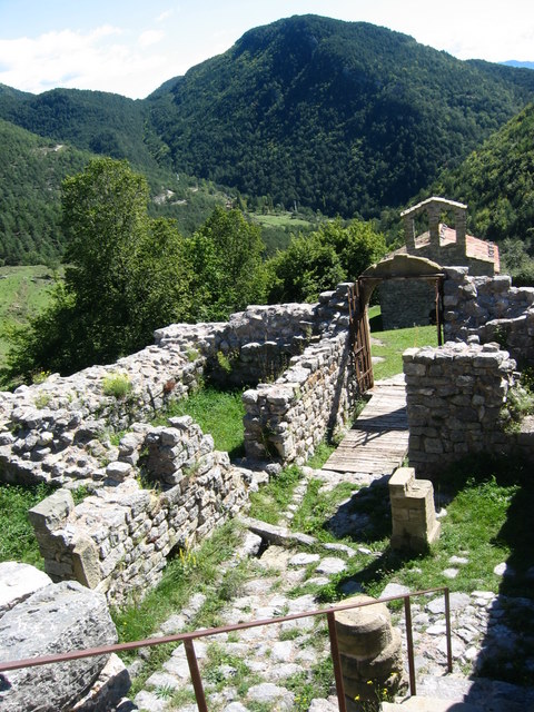 Gombrèn El castell de Mataplana. Història del castell. El castell termenat de Mataplana és documentat el 1076. El llinatge Mataplana (1), que s'hi troba instal·lat al segle XI, sembla que procedeix d'Hug Dalmau, baró del comtat de Cerdanya durant la segona meitat del segle. El comtat de Cerdanya no trigà a esdevenir propietat dels comtes de Barcelona. Els vescomtes de Berguedà eren, al segle XII, vassalls dels Mataplana per diversos dominis. Cap el 1185, Huguet de Mataplana casat amb Sança, inicià una altra branca de la família Mataplana. Hug de Mataplana i la seva muller Guillema de Sales (Ca. 1200) reproduïren en el seu castell les famoses Corts d'amor de la Provença. Així s'hi refereix un poema del trobador Ramon Vidal de Besalú (1196?-1252?). El moment més esplendorós del casal dels Mataplana s'esdevingué en aquestes dates, quan la mansió era centre de reunió de dames i cavallers, de trobadors i joglars. Duraren aquestes festes fins que el baró Hug acompanyà el rei Pere a les guerres de Tolosa i va morir per les ferides rebudes a la batalla Muret. ![]() Recreació del castell de Mataplana. Segle XII. Cartell del mirador del Castell - (Ampliar)