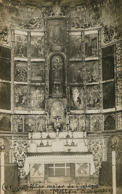 Una mostra del nivell combatiu de les tropes situades a la bossa de Molló n’és el que explica Jorge M. Reverte a "La caída de Catalunya": “12 de febrero. El sargento Luis Royo Ibáñez y cuarenta de sus compañeros de la 224 brigada reciben por un enlace el aviso de que ya pueden pasar la frontera por el coll de Ares, hacia Prats de Molló. Antes de cruzar, forman, y penetran en territorio francés al ritmo que marca el Himno de Riego. Royo va montado en su caballo, que ha conservado durante toda la retirada. Pero un gendarme francés lo tira del caballo dándole un culatazo”. ![]() Vista panoràmica d'Espinavell amb el Costabona. 1932. Valentí Fargnoli i Annetta. CRDI - Ajuntament de Girona - (Ampliar) Un altre testimoni de pas pel coll d’Ares recollit per Revert en el seu llibre: “Bartolomé Marí, el oficial de Transmisiones de la 124 brigada, de la 27 división, utiliza el truco de la cantimplora para poder pasar su pistola a Francia. Es de los últimos en cruzar porque forma parte de los que han intentado resistir el máximo de tiempo con la esperanza de organizar bien la retirada y acabar viajando al frente del centro y para reemprender allí la guerra. [...] Su contingente es ya muy pequeño. De los seiscientos hombres con que contaba su batallón, quedan muy pocos al llegar a Prats de Molló. Casi todos los nuevos reclutas se han ido quedando por el camino, han vuelto a sus pueblos confiando en que el castigo por ser soldados del Ejército Popular no sea muy severo. Marí no quiere entregarse a Franco. Desea continuar combatiendo. Pero el destino le reserva la peor de las pruebas. No luchará contra Franco, sino contra la más sádica de las versiones del fascismo: los campos de exterminio alemanes. Pasará cuatro años en Mauthausen”. ![]() Església de Santa Cecília de Molló. 1911. Valentí Fargnoli i Annetta. CRDI - Ajuntament de Girona - (Ampliar) L'església de Santa Cecília. L’actual església parroquial, romànica, va ser bastida avançat el segle XII. La volta és lleugerament apuntada, i l’absis molt desenvolupat; l’interior del presbiteri té un fris ornamental de mènsules i uns dentats que trenquen la seva gran verticalitat. Dues capelles marquen un inici de creuer, que es manifesta a l’exterior amb un mur més sortint que el de la nau. La portada, sense escultura, amb alguns arcs en degradació i unes arcuacions sota un fris esculpit i petites mènsules sobre dents de serra, tot en un mur més sobresortint i sota un petit ràfec en terrat. S'han perdut les ferramentes que ornaven la porta; resta només el gran forrellat, que figura una serp, a més dels retaules. Es destaca l’esvelt campanar, de quatre pisos, restaurat en la part superior el 1952, amb la base embeguda en els murs de l’església. Iniciat el segle XI, presenta un bonic joc de lesenes i arcuacions llombardes que marquen els diferents pisos, i hi ha dues finestres rodones bessones o ulls de bou al cim, sota la teulada. Molló té a la seva entrada una capella votiva, dedicada a sant Sebastià, amb un petit campanar de torre al costat. ![]() Pont i molí de Can Fumat, al veïnat del Riberal. Ajuntament de Molló - (Ampliar) Altres indrets del municipi. El municipi s'estructura en un agregat, Espinavell, i set veïnats. El poble d'Espinavell, situat a 1.225 m d'altitud, va créixer entorn l'església de la Mare de Déu de les Neus, del segle XVII, sufragània de la de Molló. A les faldes del poble s'estenen les Planes, l'indret on té lloc la popular Tria de Mulats d'Espinavell, cada 13 d'octubre. Les altres entitats de població o veïnats són: Fabert, el Riberal, Favars, Can Solà, Moixons, Els Grells i Ginestosa, de població disseminada en masies i cases rurals. El Riberal està situat a la ribera dreta del Ritort, a les fondalades del municipi de Molló, i en destaquen els ponts romànics de Can Fumat i Can Plaga. Aquest veïnat havia concentrat, també, el major nombre de molins del municipi (Can Fumat, Can Coronel, etc.), les turbines dels quals van donar llum al poble de Molló el 1900, un dels primers de gaudir d'aquesta energia a Catalunya. ![]() La tria de mulats d'Espinavell, fira ramadera que se celebra cada 13 d'octubre. Ajuntament de Molló - (Ampliar) ![]() Evolució demogràfica de Molló. Les dades dels anys 1497-1553 s'han estimat en base als focs: 1497, 22 focs; 1515, 32 focs; 1553, 33 focs. Les dades del període 1717-1981, corresponen a població de fet; a partir de 1990, població de dret. Dades recents extretes d'Idescat. - (Ampliar) Bibliografia