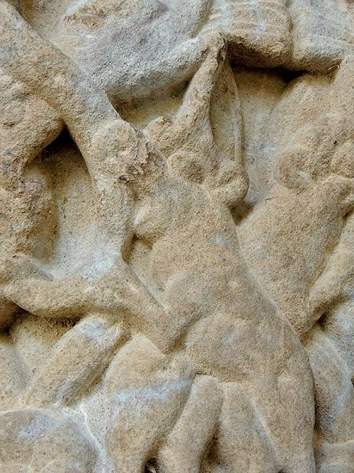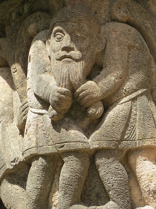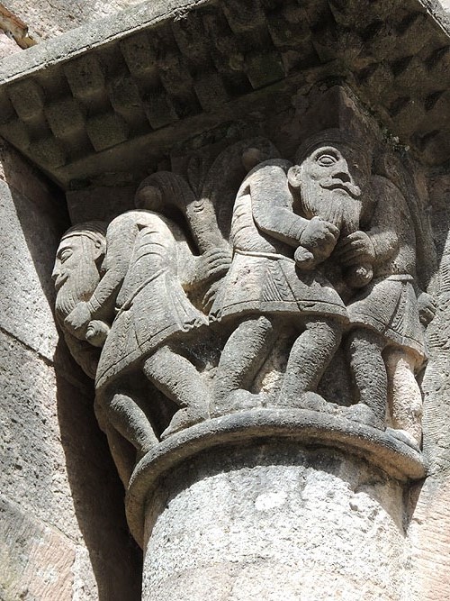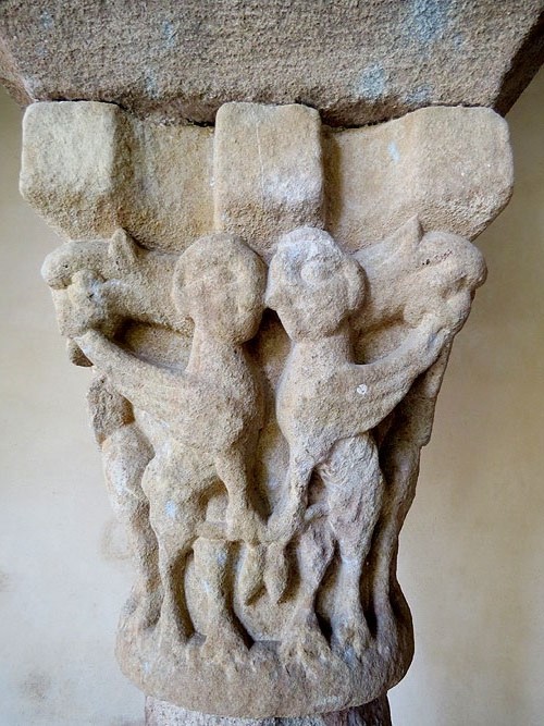 Homes amb el cap en comú estirant-se les barbes. Capitell de la capçalera del monestir - (Ampliar)