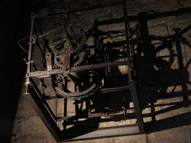 També es conserva l'antic palau abacial, del segle XV, actualment Oficina de Turisme. Ja al segle XX, la important restauració iniciada per Puig i Cadafalch i completada entre 1948-1963 per Raimon Duran i Reynals, ha tornat a l'edifici el caràcter primitiu que tenia després de la restauració de 1428. ![]() Mecanisme del rellotge de l'església - (Ampliar)