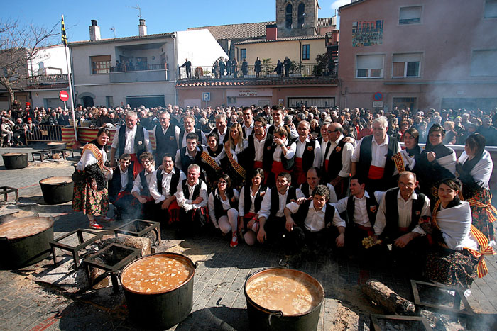 El dimarts és el gran dia; a les 6 del matí es comencen a omplir les peroles d’aigua i s’encén la llenya de pi que courà: durant vuit hores el Ranxo. A partir d’aquí, es fan bullir tots els ingredients respectant el seu temps de cocció. Paral·lelament es prepara un sofregit que s’acabarà abocant dins les peroles. Les sardanes i les carrosses se sumen a l’activitat del dia fins que arriba el moment culminant: el tastet oficial i el repartiment. ![]() Fotografia de grup dels participants en la festa del ranxo de Vidreres. 2012. Manel Lladó Aliu. CRDI - Ajuntament de Girona - (Ampliar)