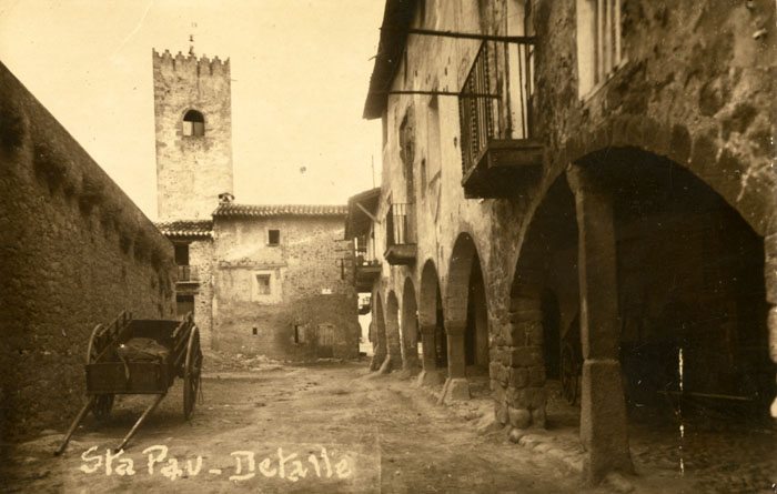 Tingué com antecedents el castell veí de Finestres i el llinatge dels Porqueres. Els senyors del castell de Finestres, després de fer construir el castell de Santa Pau adoptaren com a propi el nom locatiu, o cognom, de Santa Pau, preferint-lo al de Porqueres. En constituir-se senyors de Finestres els nobles de Porqueres, nomenaren la família Sancta Pau castlana del castell roquer, i des d'aleshores consten com a tals: Ponç I (1147), Arnau (1192), Pere (1196) i Ponç II (1218). Amb aquest darrer s'acabaren els castlans de Finestres i començaren els senyors, i després barons, de Santa Pau. ![]() Carrer de Santa Pau. 1916. Valentí Fargnoli i Annetta. INSPAI - Diputació de Girona. - (Ampliar)