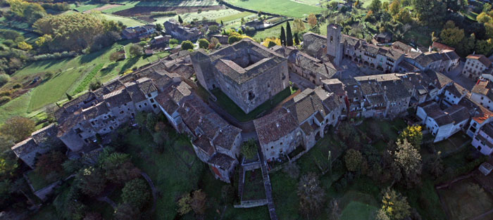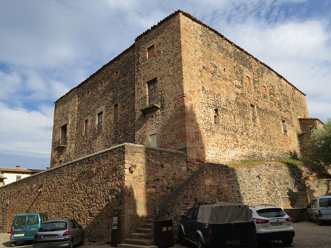 En finalitzar la guerra hi havia al costat del rei Joan II Verntallat i els remences i també el mateix Guillem d'Oms, senyor de Santa Pau i de Finestres. El 1473 el monarca ordenava a l'agutzir reial que posés Guillem d'Oms en possessió del castell de Finestres que havia estat conquerit pels remences en nom del rei i hi senyorejaven Verntallat i Pere Joan Sala. Malgrat això, el 1486 tingué lloc un darrer episodi en el qual els remences, conduïts per Narcís Goixat, prengueren el castell de Santa Pau i feren presoner mossèn Oms per tal que els lliurés la fortalesa de Finestres. Ferran el Catòlic es pronuncià contra aquest fet des d'Alcalà d'Henares i aviat tornaren els castells a mans del llinatge dels Oms. ![]() Vista aèria de Santa Pau. Ajuntament de Santa Pau. - (Ampliar) El castell de Santa Pau. És un gran casal rectangular, obra dels segles XII al XVII, amb pati interior i torre angular quadrada, amb la vila gairebé adossada a les parets del castell. Té la fesomia d'una gran pairalia senyorial fortificada, amb la planta quadrada i a la banda nord-est una torre de l'homenatge, alta, esvelta i també de planta quadrada. La torre sobresurt poc de l'edifici, però domina l'entrada. Fins al primer pis, l'edifici, està construït amb carreus i la resta amb morter. Les muralles i els fossats han desaparegut gairebé del tot però encara conserva alguns finestrals gòtics, d'altres fets el 1653 pel baró Raimon d'Oms i un pati d'armes amb una gran escala. ![]() El castell de Santa Pau. - (Ampliar)