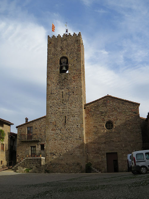 La capella baronial, molt petita, és adossada al castell. Té una porta amb un arc circular fet amb carreus de pedra regulars. Per accedir a la porta hi ha dos esglaons, i al damunt hi ha una petita obertura tipus espitllera. Forma part de la planta baixa de la torre de l'homenatge, la part més vella del castell. Hug Ademar li va fer donació d'una esplèndida Vera Creu. Al cor de la capella hi havia un retaule encastat de l'any 1340. Durant l'ocupació francesa de finals del segle XVII es va haver d'empenyorar tota la plata de la capella. Va ser restaurada l'any 1766. Les monges la van utilitzar durant un temps de carbonera i rebost. ![]() Plaça porxada de Santa Pau. - (Ampliar)
